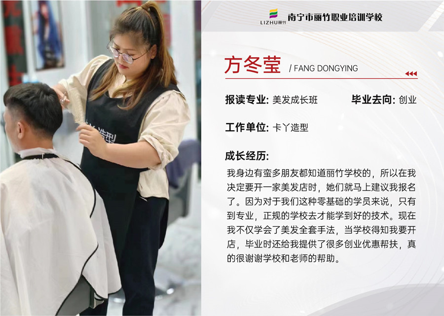 如今,她們自己開的美發(fā)店也已經(jīng)在各自的家鄉(xiāng)站穩(wěn)腳跟,生意日益紅火,日子也越過越好。同學們深知在事業(yè)上取得的成功,這一切都離不開母校的培養(yǎng)。方冬瑩更是眼含熱淚回憶起了剛剛到麗竹學習的場景。