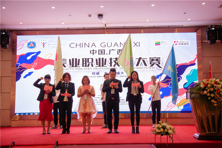 評(píng)委代表上臺(tái)宣誓:李遂中(美發(fā)評(píng)委)、黃海紅(紋繡評(píng)委)、吳艷陽(美甲評(píng)委)、蘇貴霞(化妝評(píng)委)、陸玉清( 美容評(píng)委)