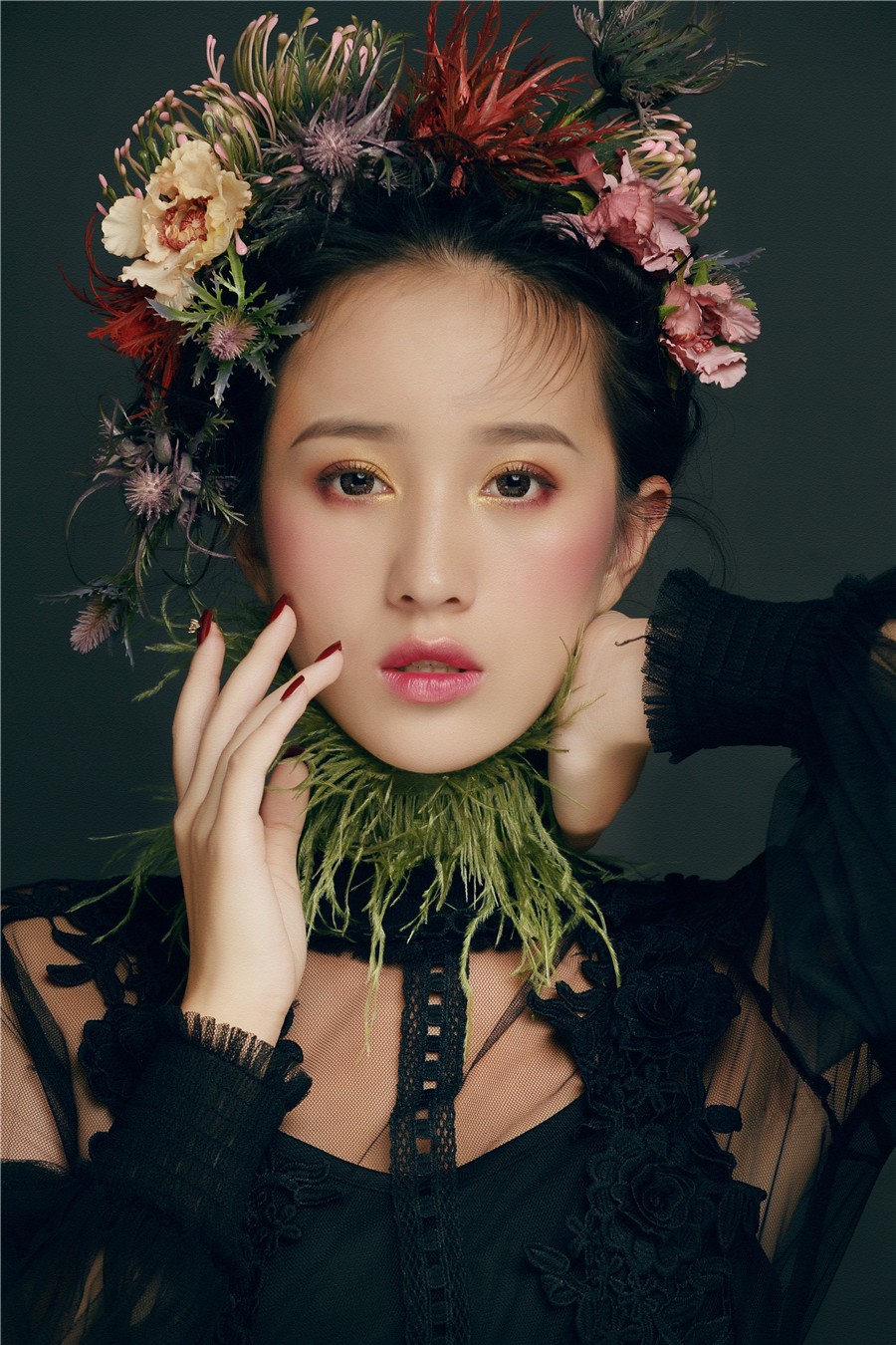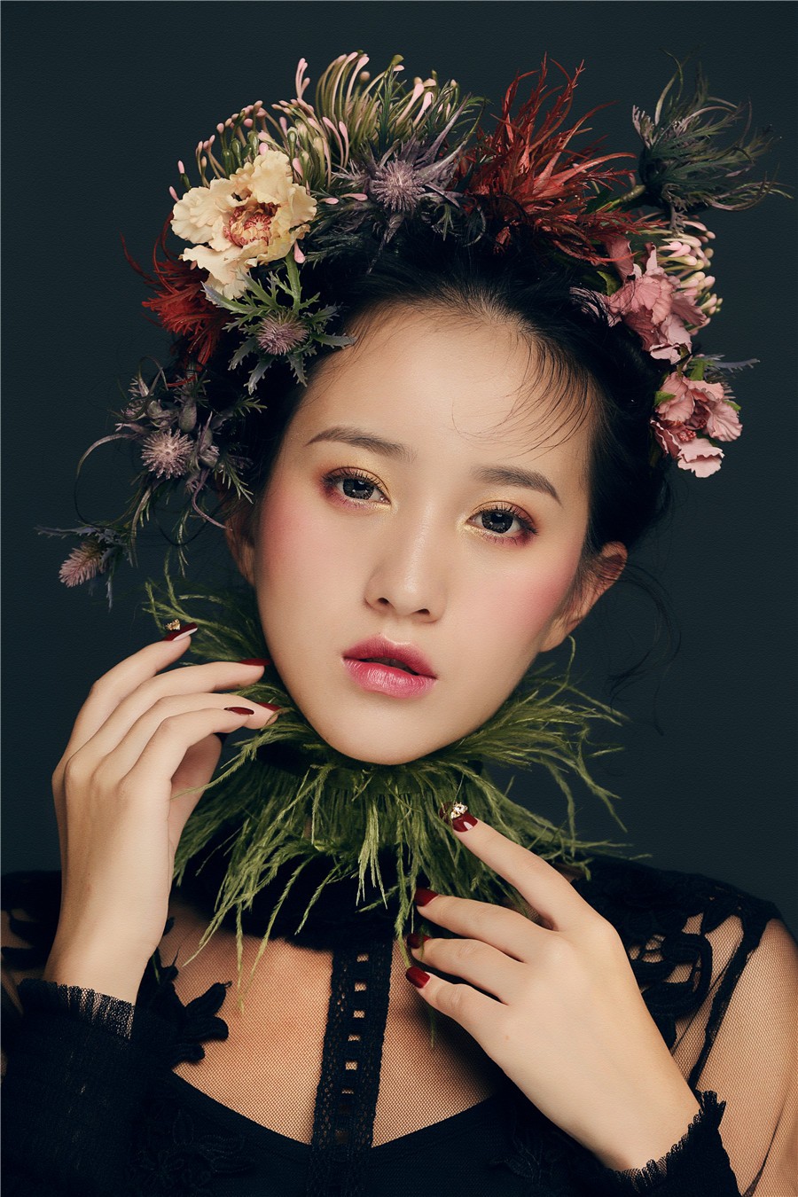麗竹學(xué)校彩妝作品--復(fù)古油畫風(fēng):飽滿濃郁的妝面色彩,配以仙氣十足森系田園風(fēng),搭上靈動(dòng)的發(fā)絲在陽光下跳躍,營造出了一種別樣的浪漫氣氛,宛如華中走出的女子。