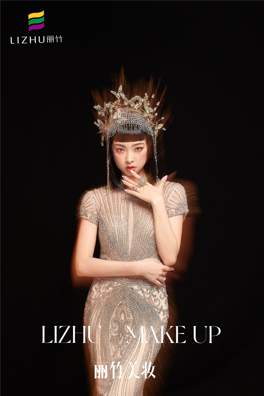 麗竹化妝學(xué)校作品---輕奢復(fù)古造型:奢華透視薄紗款禮服,勾勒出婀娜曼妙的身姿,頭飾與服飾滿鉆的鑲嵌,閃爍波光粼粼的神秘感,如夢(mèng)如幻間與現(xiàn)實(shí)交替!