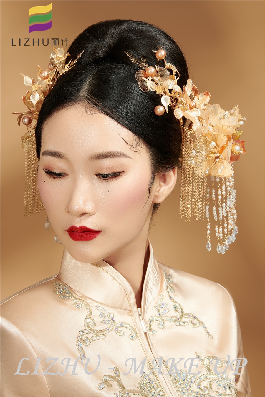 廣西正規(guī)彩妝培訓(xùn)、廣西排名前十彩妝學(xué)校作品---新中式新娘造型:飽滿的低卷筒盤發(fā),佩戴鎏金玉釵玉簟點(diǎn)綴,女子的優(yōu)雅古典、大方完全展現(xiàn),打造古香古色韻味十足的新中式新娘。廣西彩妝學(xué)校十大名校-麗竹學(xué)校常年開(kāi)設(shè)廣西彩妝培訓(xùn)班,歡迎大家進(jìn)班參觀試聽(tīng)。
