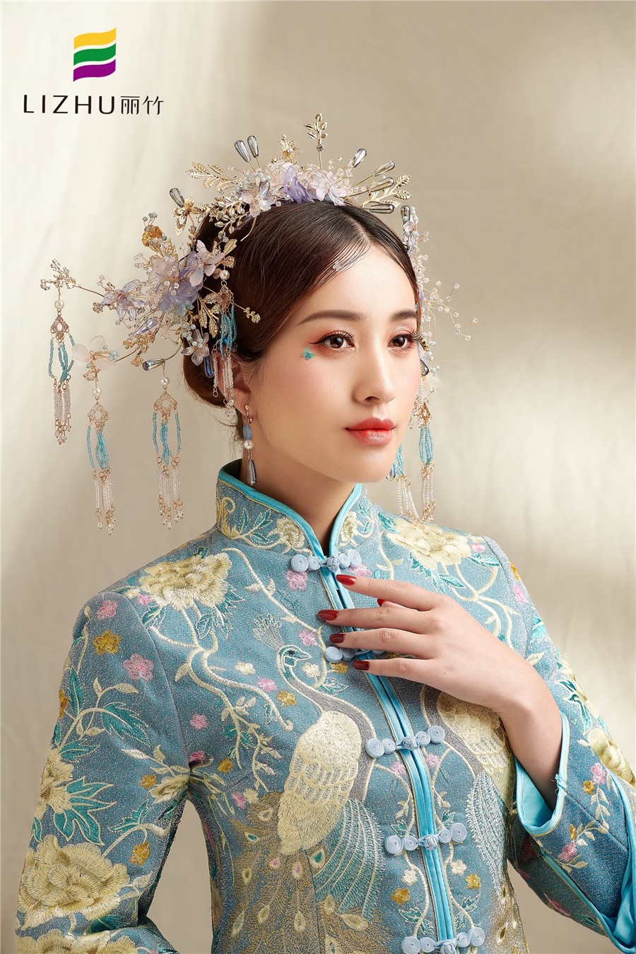 麗竹學(xué)校彩妝作品---中國藍(lán)秀禾新娘造型:簡潔優(yōu)雅的盤發(fā),配上秀麗柔美的妝容,滿眼柔情溢出眼角眉梢,極具優(yōu)雅端莊大方之余,更加顯得姿態(tài)婀娜多姿。
