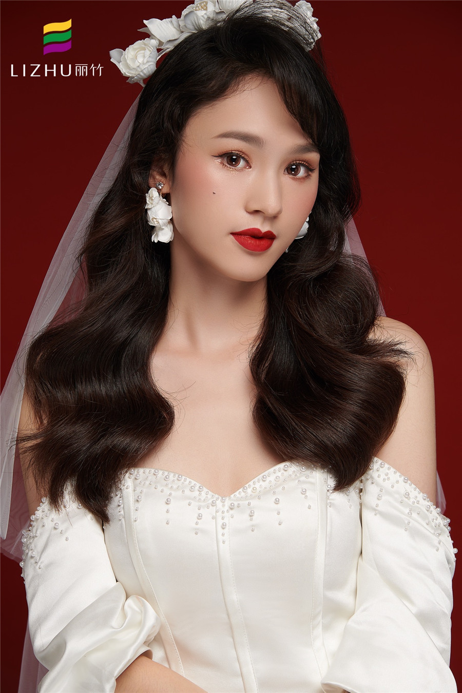 南寧人氣高的化妝學校作品---韓式披發(fā)新娘造型:很淑女又具優(yōu)雅風的長卷發(fā)發(fā)型,佩戴白色鮮花點綴的純白頭紗,配上清透簡約的韓式妝容,打造出了新娘優(yōu)雅的浪漫氣息。