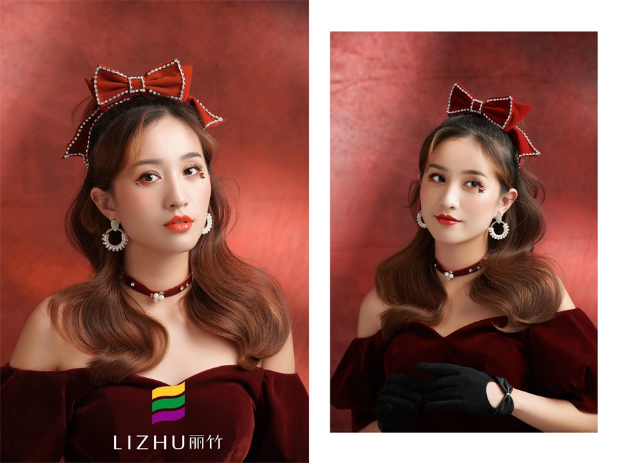酒紅色絲絨大裙擺露肩禮服,少女甜美可人的妝容,佩戴珍珠視頻點(diǎn)罪的項(xiàng)圈及耳環(huán),頭戴亮鉆點(diǎn)綴超大蝴蝶結(jié)的公主披發(fā)造型,妥妥一個(gè)蝴蝶結(jié)在逃公主的形象迎面展開。