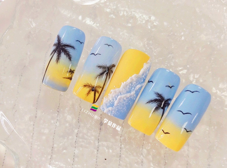 相信很少有人會(huì)不喜歡陽(yáng)光,沙灘,大海的吧!郁郁蔥蔥的椰子樹佇立在海邊,陽(yáng)光暖暖的照在細(xì)軟的沙灘上,沙子發(fā)出一閃一閃亮晶晶的光,仿佛一顆顆正在發(fā)光發(fā)亮的鉆石閃耀。俏皮的海星和貝殼沖上沙灘,給自己進(jìn)行了一場(chǎng)陽(yáng)光浴。高空飛翔的海鷗,則展開雙臂,自由盤旋在海面上,與海浪盡情嬉戲,好一副碧海藍(lán)天的愜意景象!既然去不了海邊,那么就把海邊美景畫在你的“指”上吧!