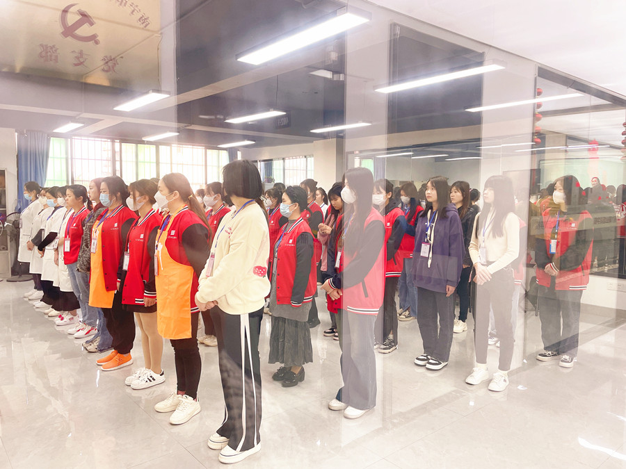 美發(fā)新生正在進(jìn)行入學(xué)晨會(huì)練習(xí)
