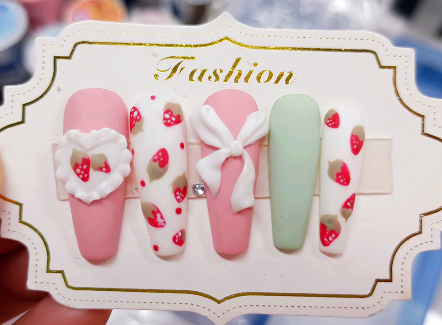 廣西學(xué)美甲:以少女們喜愛的粉色和白色作為主色調(diào),馬卡龍綠色則作為點睛之筆。之后使用彩繪筆專業(yè)描繪出可愛草莓圖案,配上粘貼白色蝴蝶結(jié)和愛心飾品做點綴,直接將草莓彩繪美甲的可愛感氛圍拉滿。