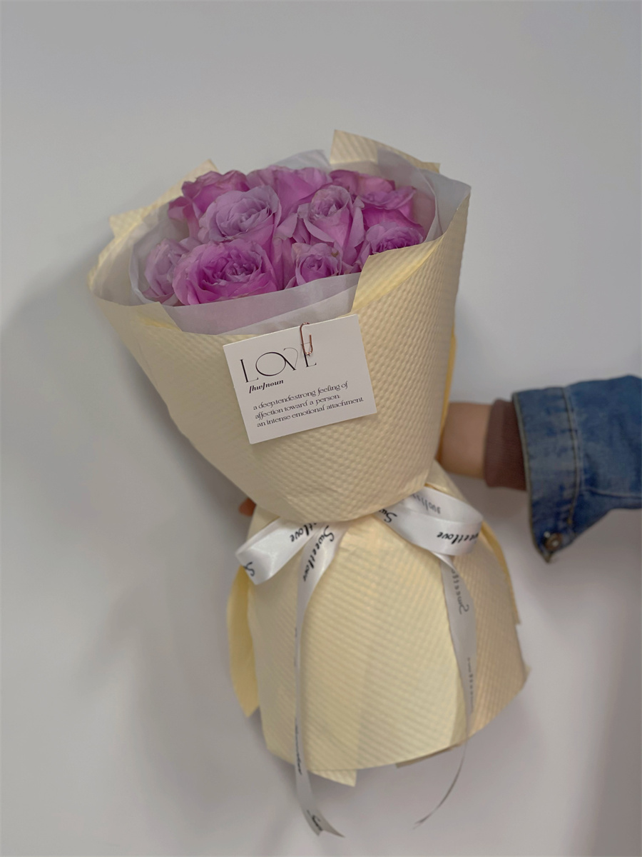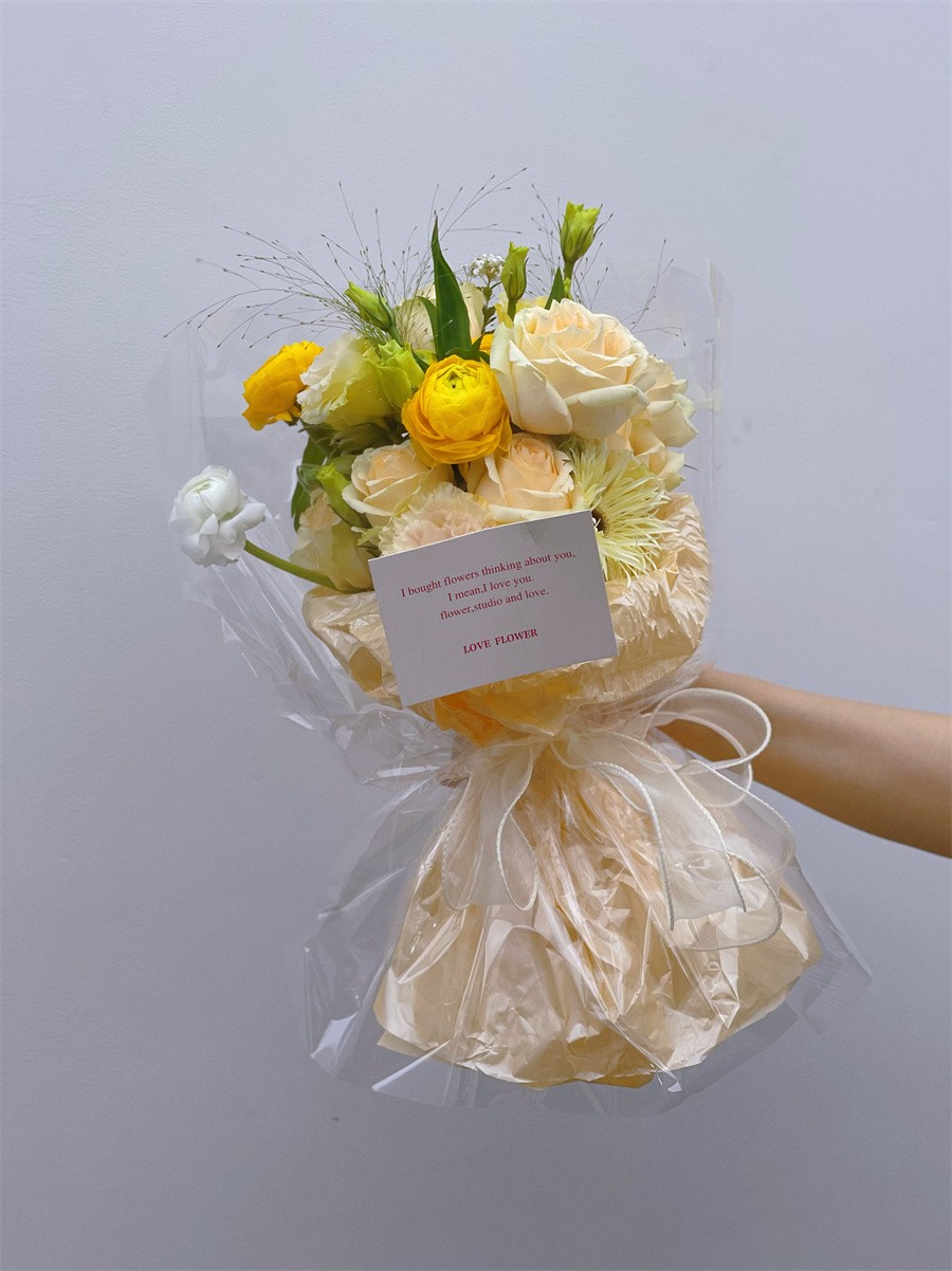 在進(jìn)行圓形花束的制作時(shí),在確定主花后,便可以按照螺旋的方式一次添加花材,使得整束花看起來飽滿之后,稍作調(diào)整成為一個(gè)圓形的輪廓,然后便可以用繩子在根部綁好進(jìn)行修剪?;ú奶幚砗昧酥?,將包裝紙裁剪出適當(dāng)?shù)拇笮?,然后根?jù)花的形狀包裹起來,用彩帶幫緊并打成一個(gè)蝴蝶結(jié),這樣圓形小花束就完成了。