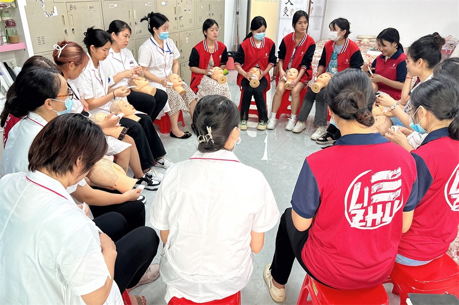 麗竹美容考證班學(xué)員在老師輔導(dǎo)下進(jìn)行假人面部管理練習(xí)