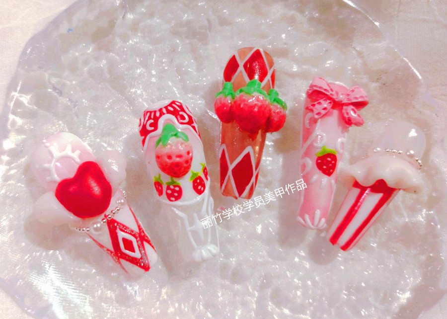 廣西美甲培訓課堂、廣西美甲速成班:在廣西美甲師專業(yè)學校的課堂上,廣西南寧美甲培訓班老師們讓大家以“草莓”為主題繪制款式,表現(xiàn)形式不限。下面,就趕緊和我們一起去看看廣西美甲造型學校-麗竹美甲造型學校學員的作品---草莓洛可可美甲。