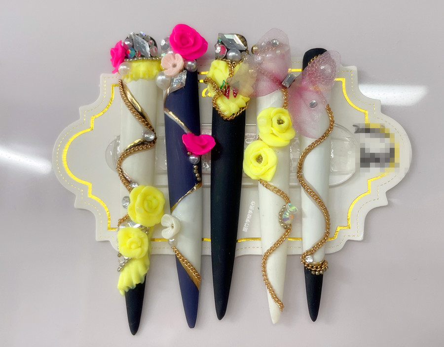 美甲師們在特別定制的長甲片上,通過采用彩繪,粘貼飾品,雕花,暈染等手法繪制出各種不同風格的圖案。圖案的款式可以根據(jù)個人喜好而定,可以是彩繪水墨畫,輕奢復古的堆鉆款,也可以是充滿二次元的漫畫款……只要你喜歡,天馬行空任你畫。