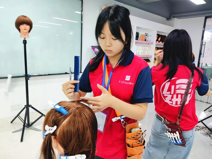 看完課堂上老師的手法示范,廣西美發(fā)培訓(xùn)班的同學(xué)進(jìn)行頭模練習(xí)