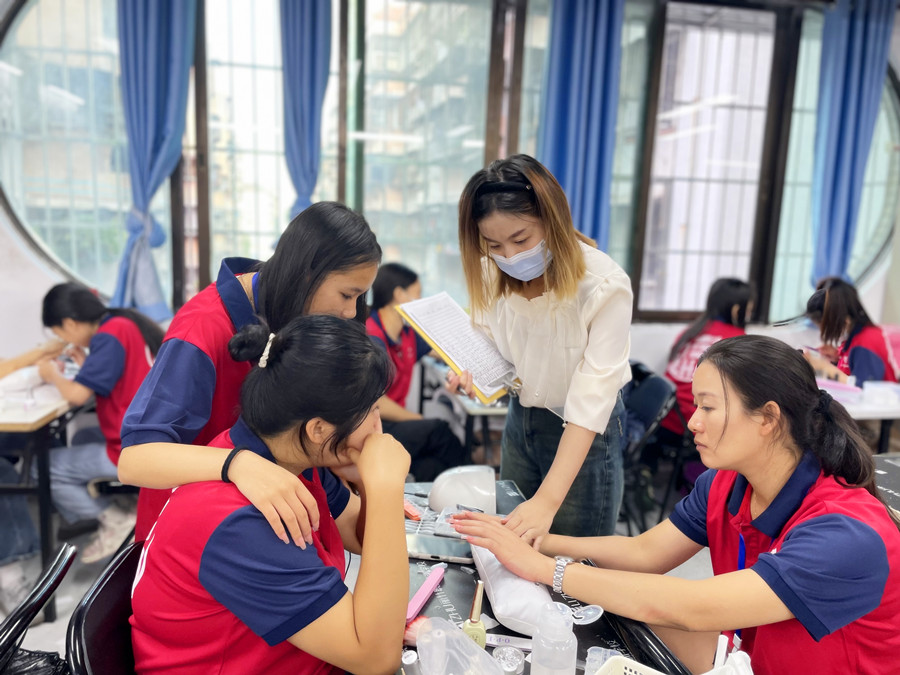 麗竹美甲培訓(xùn)老師課堂指導(dǎo)同學(xué)們練習(xí)