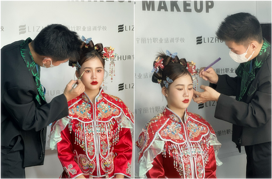 廣西學秀禾造型、廣西化妝師:中式之美,總能將女性的溫柔婉約完 美展示在眾人眼前。進而越來越多新娘子都會在婚禮當天選擇極具中國特色的中式秀禾造型演繹自己的幸福。那么,剛剛進入到廣西新娘造型專業(yè)學校(麗竹新娘造型培訓(xùn))學習的化妝新手們,下面就趕緊看看廣西化妝彩妝進修班的玉老師為大家講解的中式秀禾妝容特點吧!
