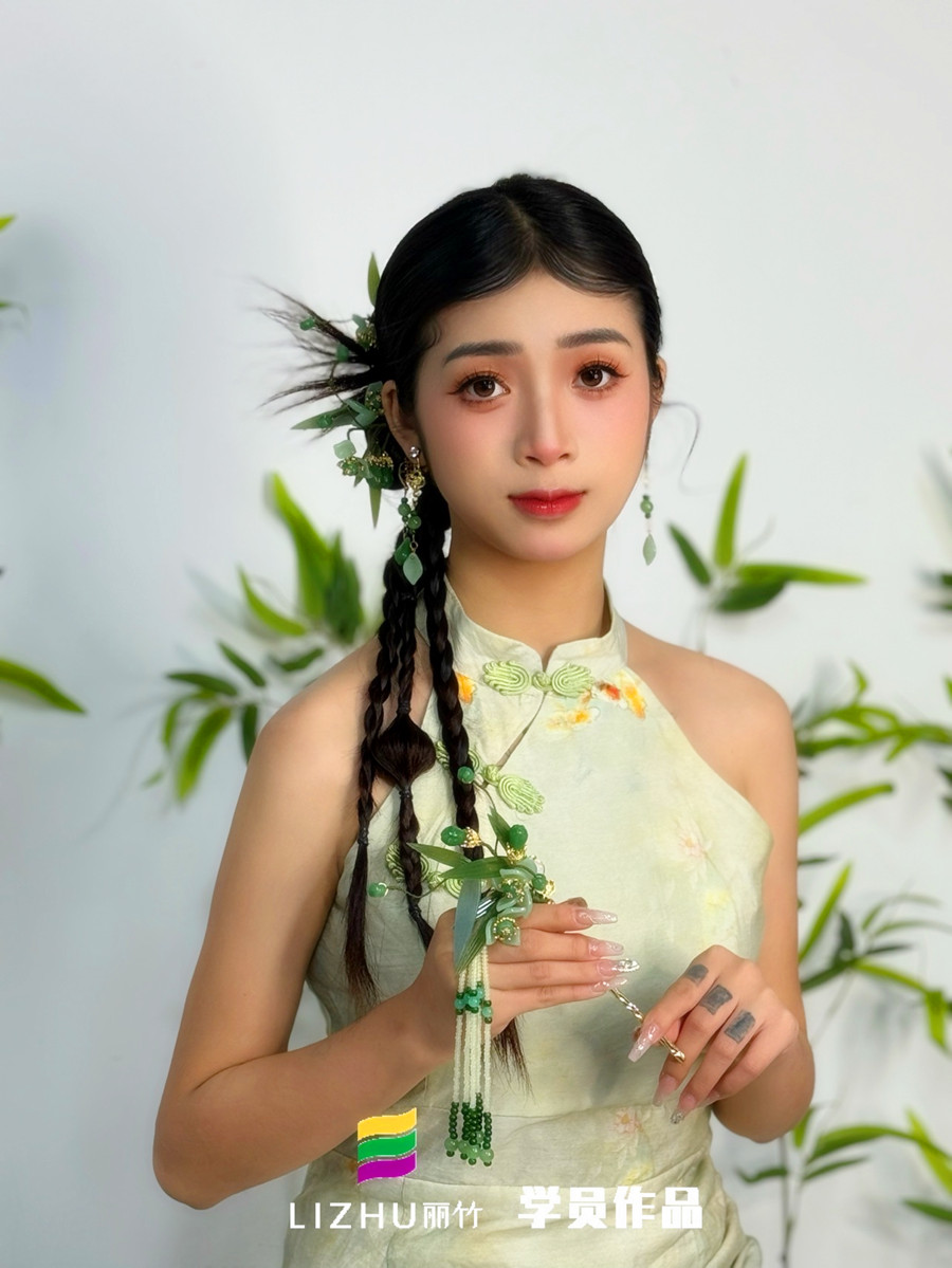 南寧化妝影樓造型、南寧化妝影樓培訓(麗竹彩妝寫真培訓)---新中式造型:新中式長裙復古迷人,古風盤發(fā)戴翠綠珠釵,綠色搭配竹葉的設計,給人一種淡雅的感覺。如果你想學個人寫真藝術照造型,或是想在南寧培訓寫真化妝,學更加全面的化妝技術,建議你可以趁著麗竹學校正在進行春季招生優(yōu)惠活動,趕緊聯系我們報名吧!