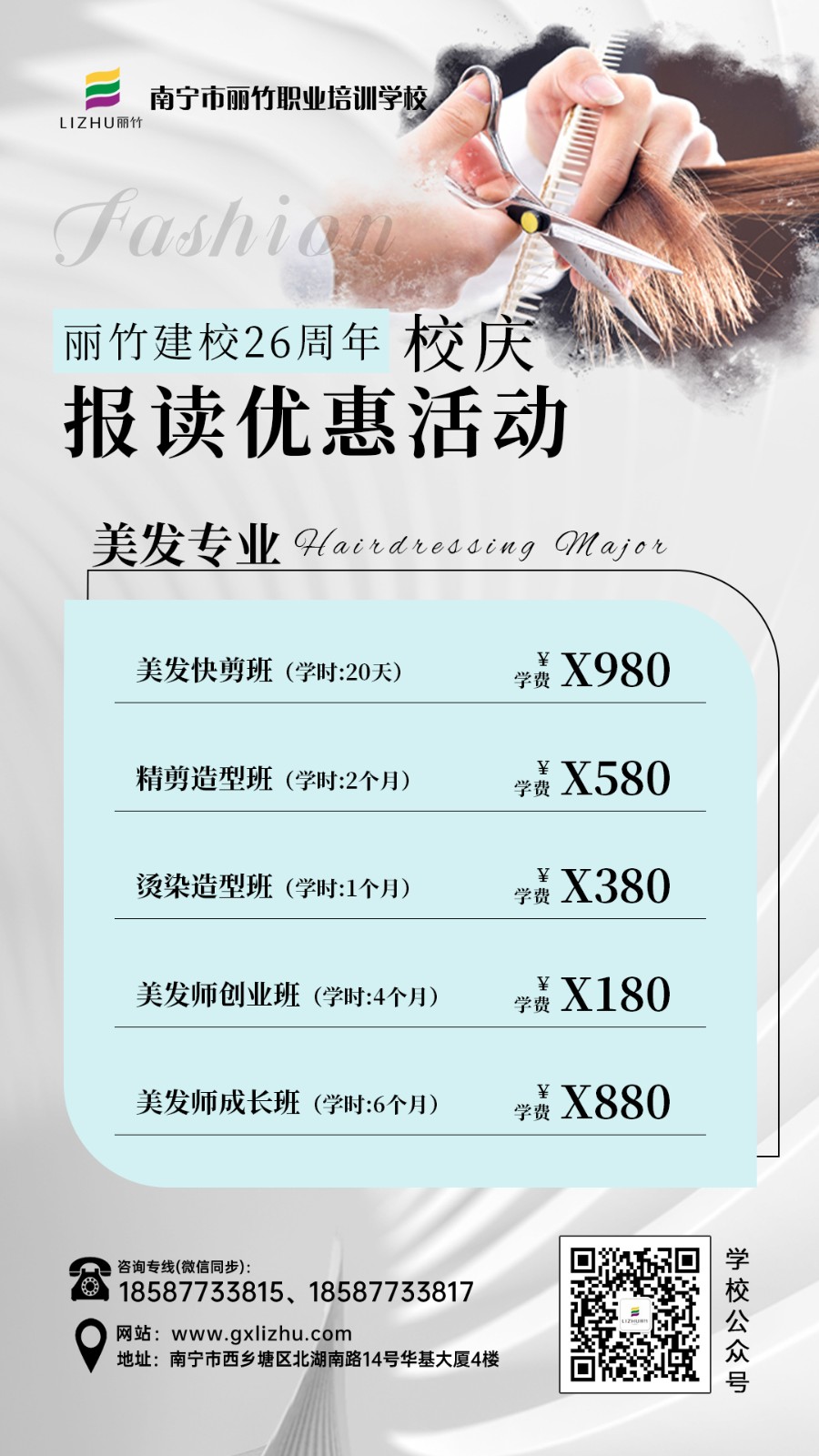 南寧女發(fā)造型、南寧理發(fā)剪發(fā):南寧剪發(fā)造型學(xué)校(麗竹剪發(fā)造型學(xué)校)接下來就為大家分享兩種常見的南寧剪發(fā)培訓(xùn)的內(nèi)容---女士發(fā)尾修剪方法。麗竹學(xué)?,F(xiàn)在正在進(jìn)行學(xué)費(fèi)報名優(yōu)惠活動,兩種不同內(nèi)容的活動,相信總有一個適合你。所以,想學(xué)美發(fā),就趕緊報名吧!