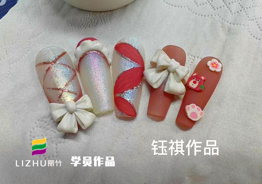 南寧學(xué)美甲款式(麗竹美甲造型培訓(xùn))學(xué)員作品:手工蝴蝶結(jié)雕藝