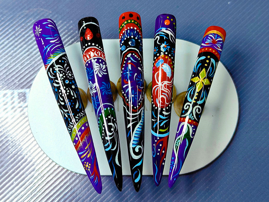美甲技法解析:作品全程采用手繪的方式進(jìn)行描繪。其難點(diǎn)在于對于壯錦五顏六色的色彩比例搭配,圖案間的結(jié)構(gòu)嚴(yán)謹(jǐn)性,排列布局的整體把握,以及在描繪圖案時(shí)需要極強(qiáng)的細(xì)心和耐心。