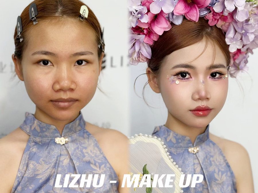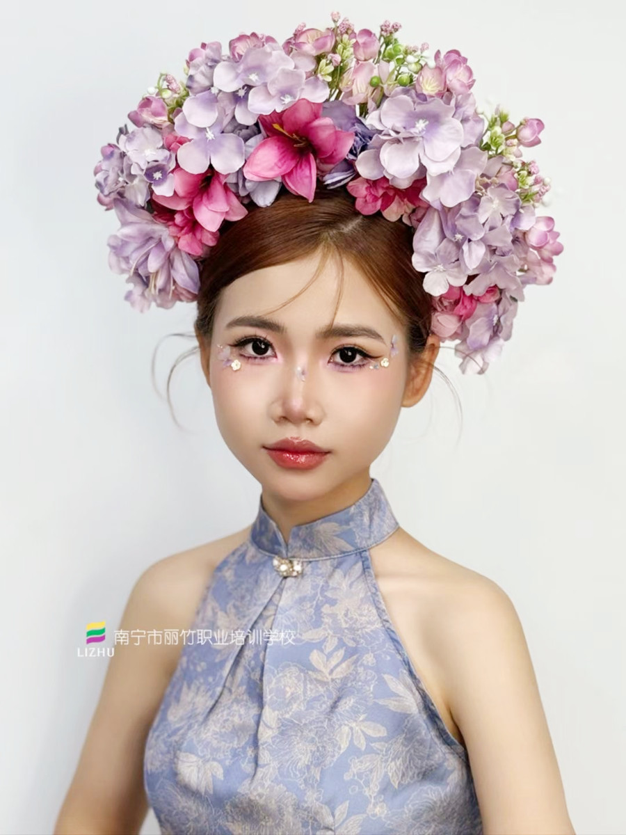 簪花造型課堂實況,廣西美妝課堂作品欣賞