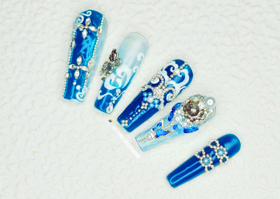 克萊因藍(lán)貼鉆美甲,南寧美甲造型專業(yè)學(xué)校實(shí)訓(xùn)作品
