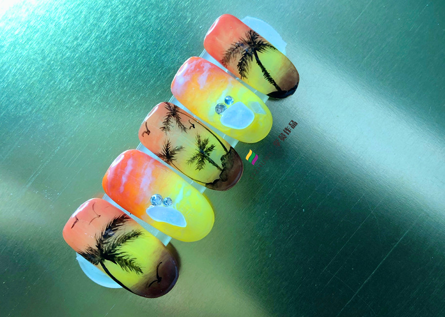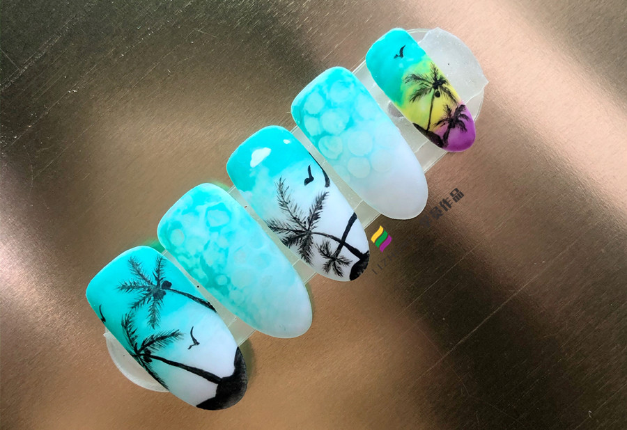 廣西美甲教育、廣西美甲職業(yè)培訓(xùn)中心:說(shuō)到夏日度假,怎么能少了藍(lán)天,白云,大海,椰樹(shù),海鷗晚霞呢?如果你因?yàn)榉N種原因不能開(kāi)啟海邊假期,那不如就將這些經(jīng)典的夏日海邊元素繪制在你的美甲上吧!接下來(lái),就趕緊來(lái)看看零經(jīng)驗(yàn)在廣西學(xué)美甲的學(xué)員,在廣西美甲專(zhuān)業(yè)學(xué)校(麗竹美甲專(zhuān)業(yè)學(xué)校)經(jīng)過(guò)一個(gè)多月學(xué)習(xí)后繪制的夏日椰樹(shù)美甲吧!