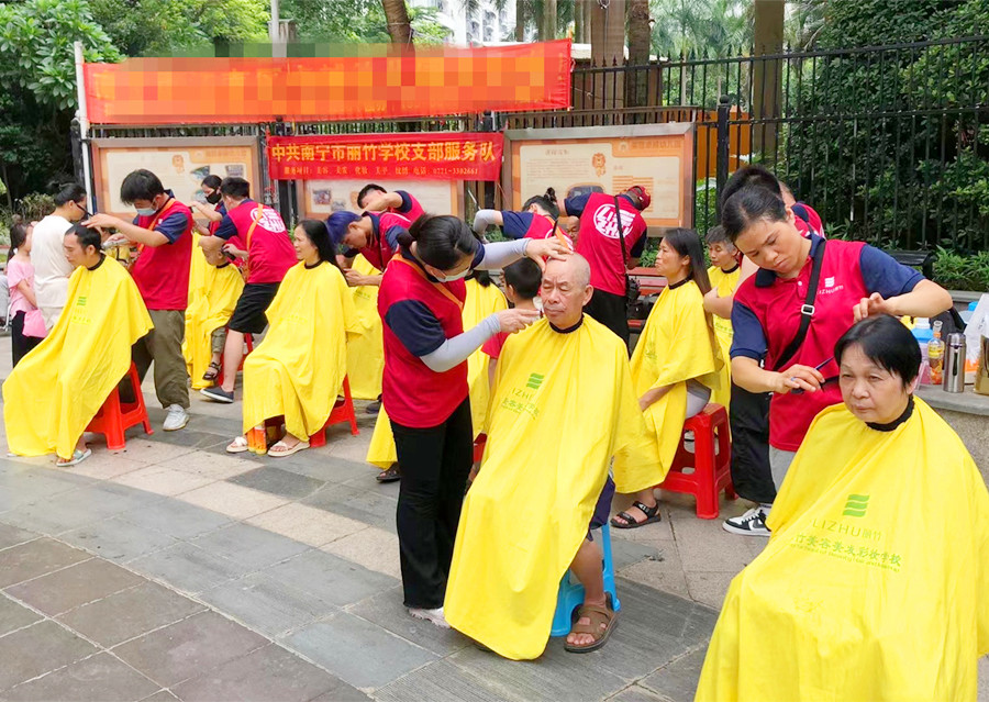 廣西剪發(fā)免費(fèi)、廣西剪發(fā)公益活動(dòng):驕陽似火,又怎樣?酷暑難耐,又怎么樣?只要群眾需要,廣西美發(fā)職業(yè)技校(麗竹美發(fā)職業(yè)技校)的志愿者們,就會(huì)來到大家的身邊。作為8月份的首場(chǎng)公益理發(fā)活動(dòng),學(xué)員們?cè)邳S老師的帶領(lǐng)下來到了華南城社區(qū),為居民們提供理發(fā)服務(wù)。