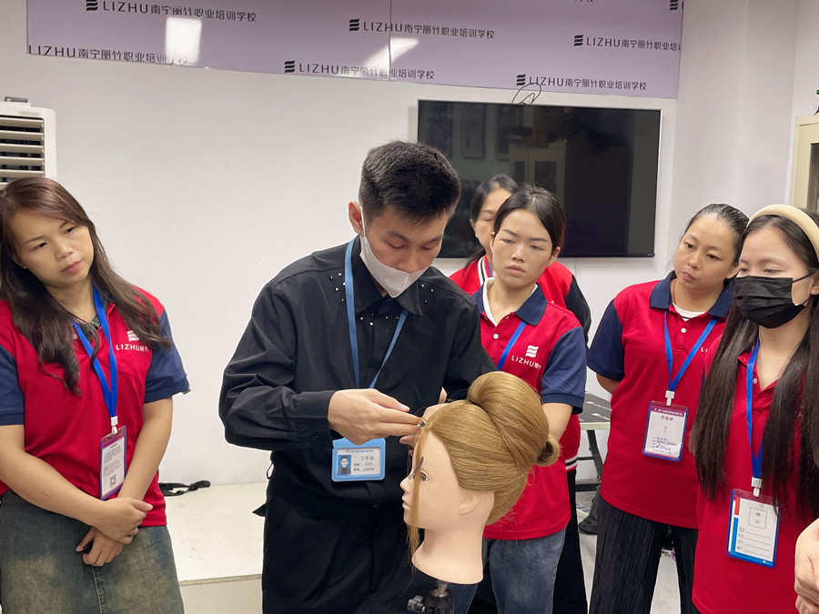 南寧化妝編發(fā)、南寧學(xué)盤(pán)發(fā):南寧化妝發(fā)型學(xué)校(麗竹化妝發(fā)型學(xué)校)就為大家演示下南寧專(zhuān)業(yè)化妝發(fā)型課程里關(guān)于赫本頭發(fā)型手法技巧的內(nèi)容。然后在采用倒梳的方法將頭發(fā)打成蓬松的狀態(tài),用手調(diào)整發(fā)型團(tuán)狀,并利用固定發(fā)夾將團(tuán)狀秀發(fā)牢牢固定在頭頂。之后用在將團(tuán)狀的發(fā)髻往兩邊撥弄成扇形展開(kāi),梳理四周頭發(fā)到服帖,用發(fā)膠固定好形狀即好。