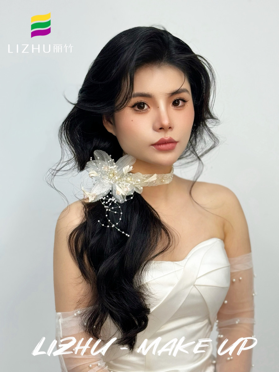 廣西學(xué)化妝影樓、廣西寫(xiě)真化妝,廣西新娘妝跟妝培訓(xùn)(麗竹寫(xiě)真化妝培訓(xùn))--- 韓式側(cè)扎紋理新娘:氧氣清新的自然無(wú)痕妝容,優(yōu)雅隨意的紋理韓式卷發(fā),白色蕾絲珠花頭飾側(cè)扎發(fā),打造氣質(zhì)滿滿的元?dú)饷郎倥?