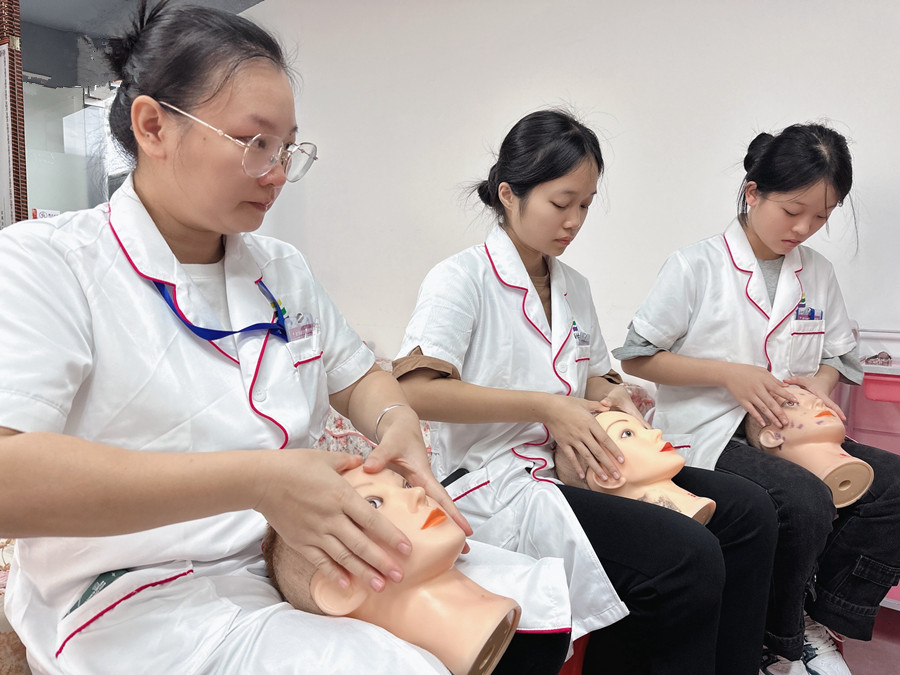 想要學好面部護理,通過使用假頭模去熟悉一些面部知識以及操作技巧極為重要!皮膚生理結構知識,頭面部護理重 點位置分布認識,面部護理準備工作(消 毒、包頭、洗臉、卸妝等),以及面部按 摩手法教學(中式)等。