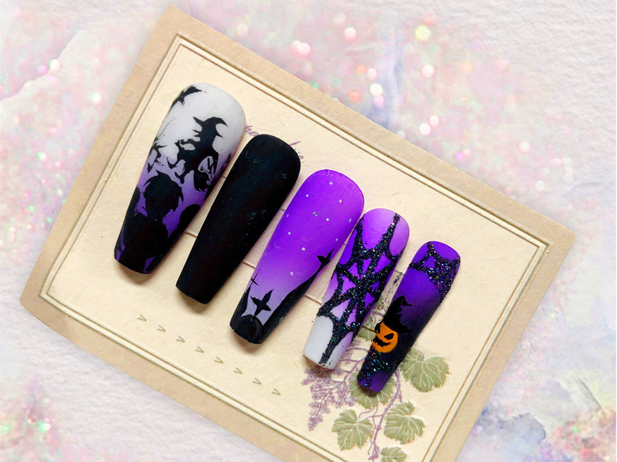 美甲繪制靈感來源:神秘深邃的夜色里,黑色剪影下的女巫騎著掃把,在烏鴉的陪伴下,從男孩眼前飛過。在靜謐的得白色月光照耀下,閃現(xiàn)出一幅既充滿童趣,又略帶詭異氛圍的剪影畫面。