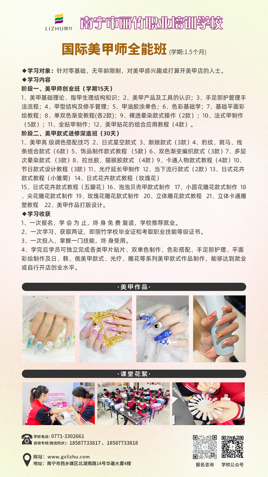 如果你本來就對美甲技術(shù)感興趣,或是如果你本有美甲基礎(chǔ),只想找一家專業(yè)美甲學(xué)校提升美甲技術(shù),那么不妨到麗竹麗竹學(xué)校美甲進(jìn)修班看看吧!無論你是哪種需求,相信我們的招生老師總能幫到你選擇合適的課程。