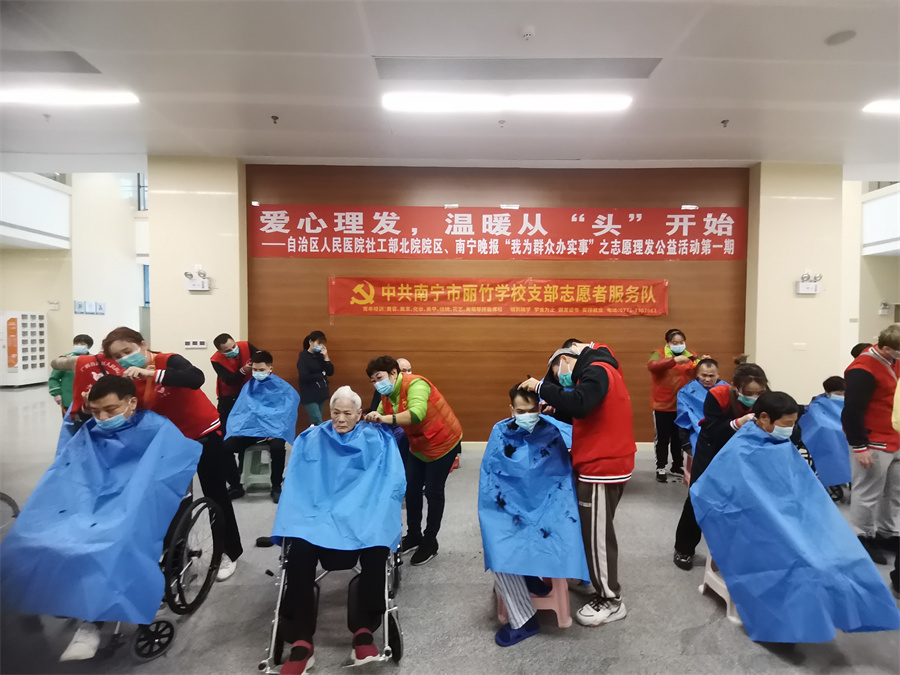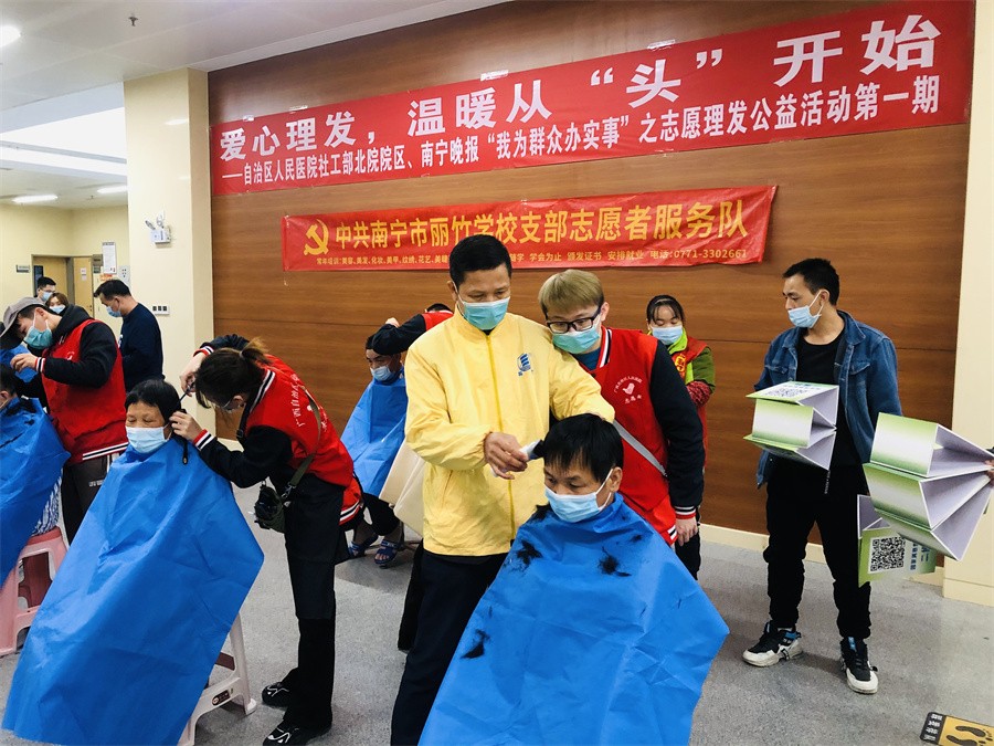 愛(ài)心理發(fā)進(jìn)醫(yī)院、南寧美發(fā)學(xué)校志愿理發(fā)活動(dòng):12月3日,對(duì)于一些長(zhǎng)期待在醫(yī)院的患者和家屬而言,不能隨意外出,久而久之理發(fā)成為了“頭”等大事。知道這樣的情況后,中共麗竹學(xué)校學(xué)校支部志愿者服務(wù)隊(duì)主動(dòng)申請(qǐng)參加由南寧晚報(bào)“愛(ài)幫之家”聯(lián)合自治區(qū)人民醫(yī)院北院共同舉辦的---愛(ài)心理發(fā),溫暖從“頭”開(kāi)始志愿公益理發(fā)活動(dòng),發(fā)揮專業(yè)特長(zhǎng),為有需要的人提供綿薄之力。