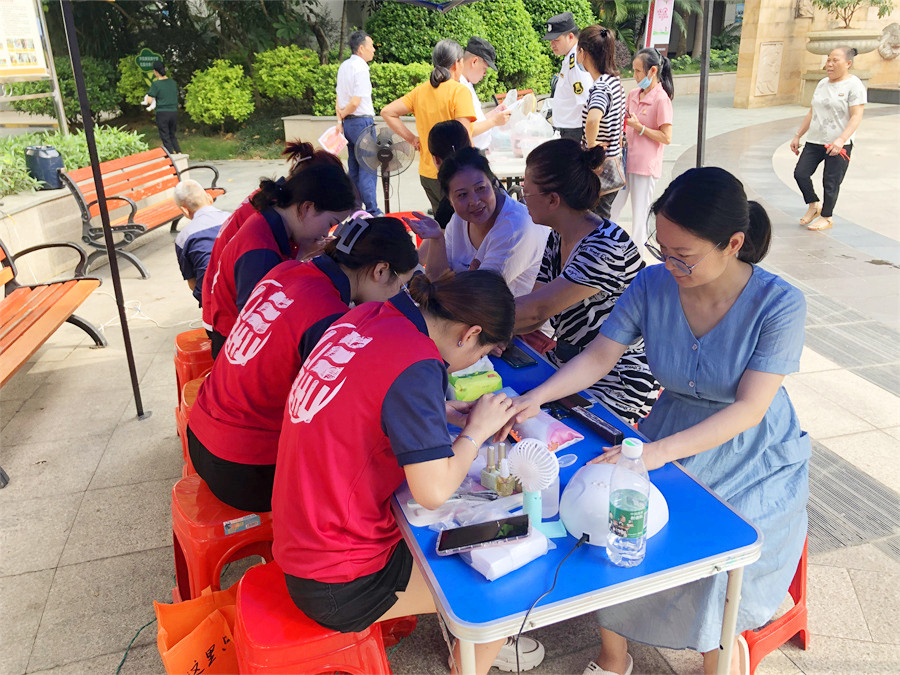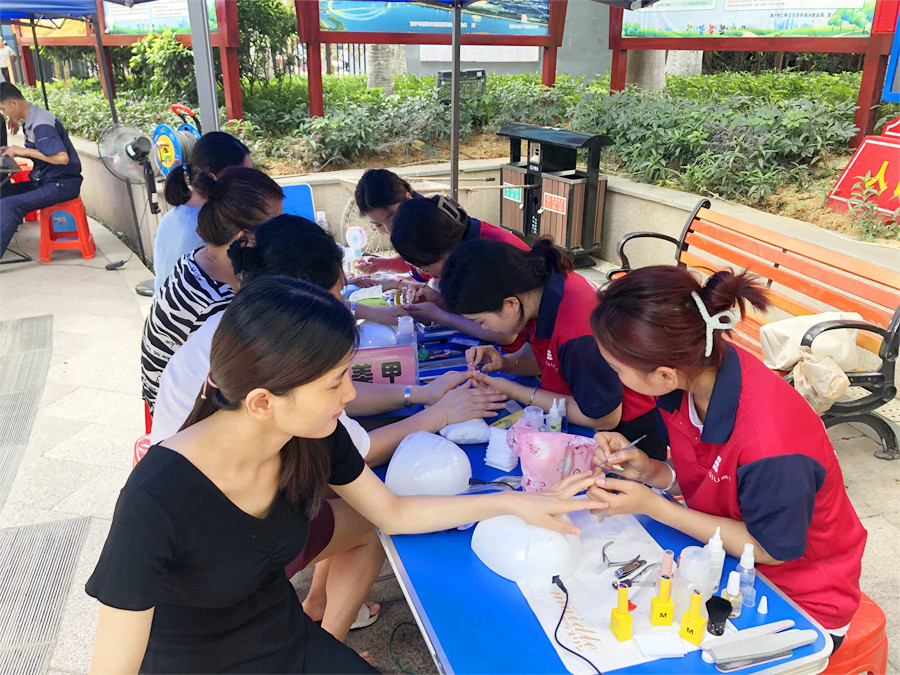 雖然有帳篷作為乘涼物遮擋,但不斷從地面向上生氣的熱氣,以及沒有任何一絲微風(fēng)吹過,還是讓廣西美甲培訓(xùn)班的學(xué)員們汗流浹背。但看著越來越多的居民蜂擁而至,學(xué)員們來不及擦拭額頭上的汗珠,依舊細(xì)心地詢問每一位居民的需求,然后便又快又專業(yè)的開始操作。