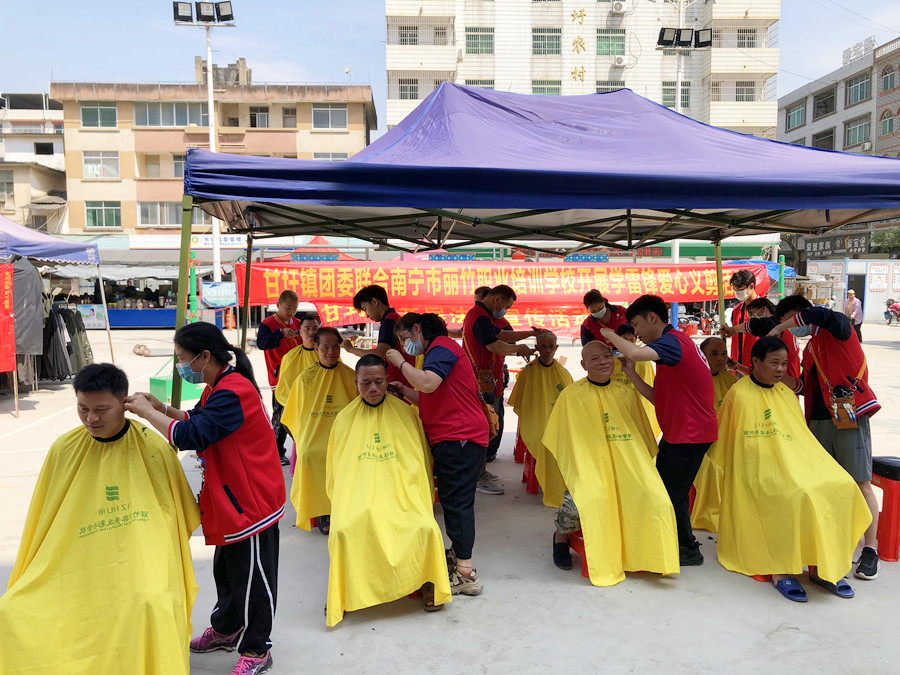 學(xué)雷鋒愛心剪發(fā)、南寧免費(fèi)剪發(fā)活動(dòng):4月16日,甘圩鎮(zhèn)團(tuán)委聯(lián)合南寧市麗竹職業(yè)學(xué)校(南寧美發(fā)職業(yè)學(xué)校)開展“學(xué)雷鋒”愛心義剪活動(dòng)。在鎮(zhèn)中心的小廣場上,身著紅色麗竹學(xué)校校服的南寧美發(fā)理發(fā)培訓(xùn)班的美發(fā)志愿者搭起帳篷,擺好凳子,拿出理發(fā)工具,前來理發(fā)的人已經(jīng)排起了隊(duì),他們中有高齡老人、附近務(wù)工人員、小朋友等。