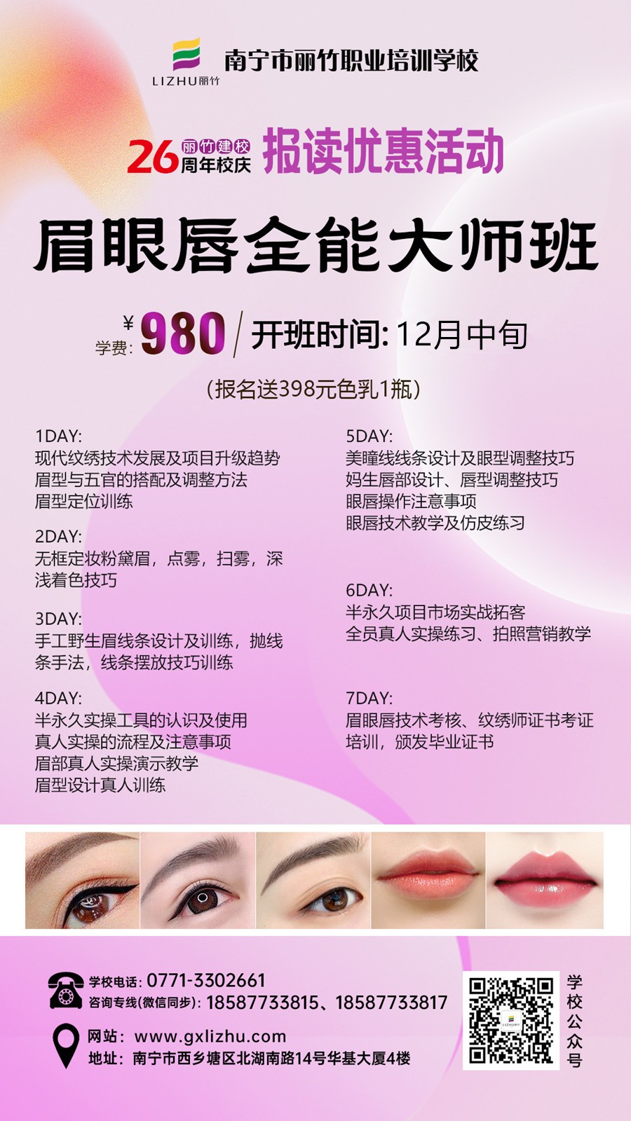 年前給自己一個(gè)快速學(xué)習(xí)一門技術(shù)的機(jī)會,抓住今年的尾巴,為新一年的到來開個(gè)好頭。南寧紋繡師培訓(xùn)-麗竹學(xué)校12月紋繡全能班(眉眼唇全能大師班)啟動開班招生中,現(xiàn)在報(bào)名僅需980元,還能額外贈送398元色乳1瓶。想在南寧學(xué)紋繡的小伙伴,趕緊聯(lián)系我們報(bào)預(yù)定學(xué)習(xí)名額的吧!