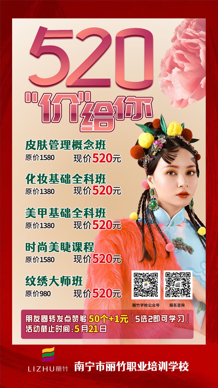麗竹學(xué)?!?20告白季”重磅推出5大“美麗護膚系列”課程,原價值3160元的培訓(xùn)項目,轉(zhuǎn)發(fā)朋友圈點贊集50個 + 截圖保存,只需520+1元,即可從5門課程選2門學(xué)習(xí)?;顒訒r間為:5月20日當(dāng)天報名的29個名額