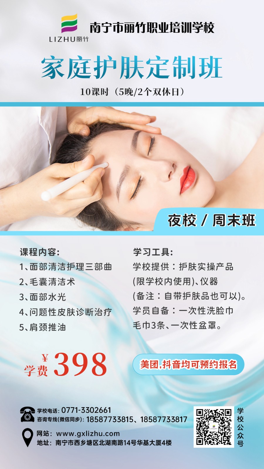 南寧美容護膚培訓(xùn)學(xué)校(夜班/周末班):家庭護膚定制班